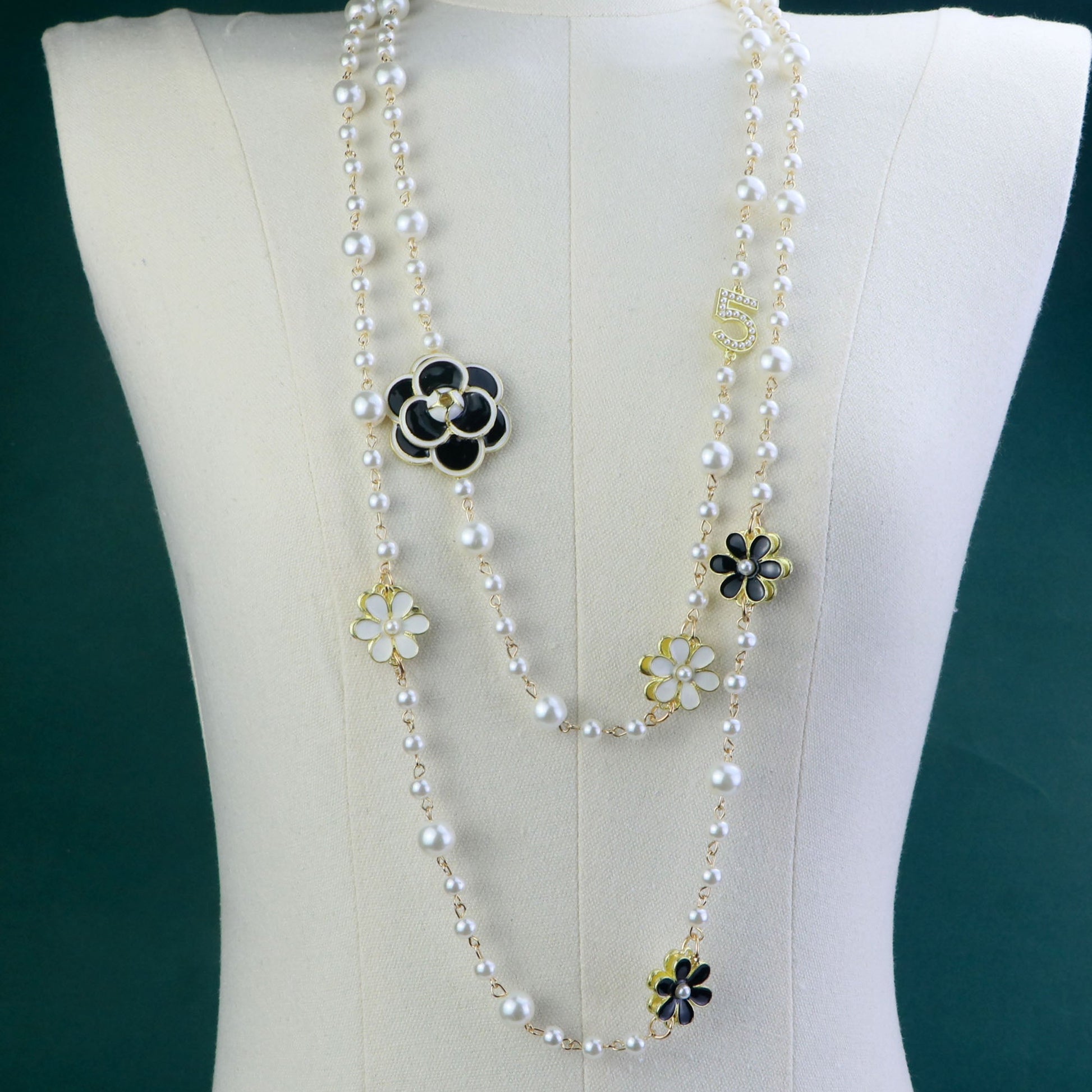 Double Layered Camellia Pearl Necklace,Elegant Rose Flower Sweater Chain Necklace,White Black Pearl Long Chain Necklace,Gift for her