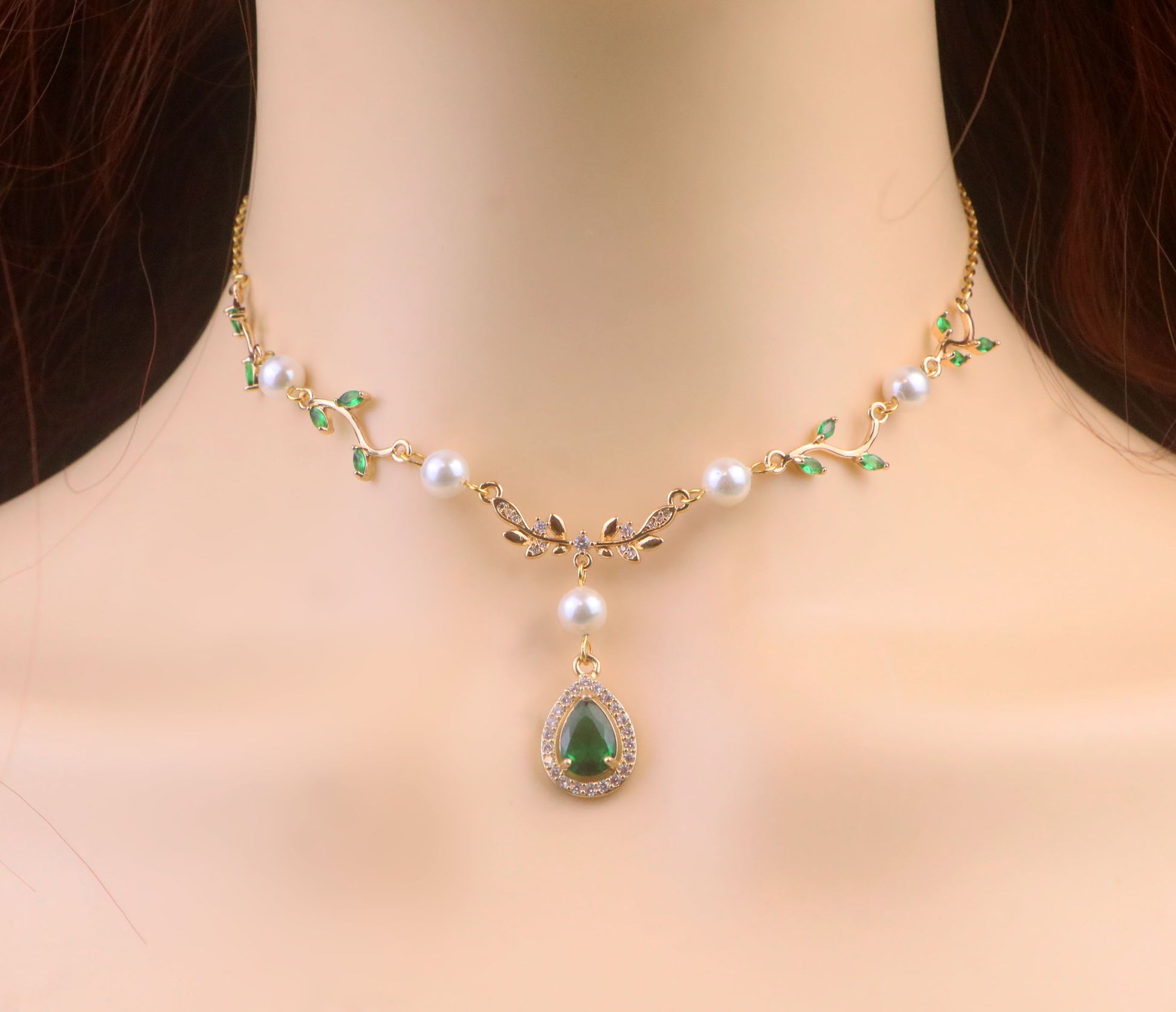 Gold Green Leaf Pearl Fairy Choker Necklace,Olive Leaf Vine Necklace,GreenTeardrop Necklace,Flower Teardrop Necklace,Leaf bridal Necklace,Fairy Choker Necklace,Stainless Steel Chain,Gifts For Her (DE73)