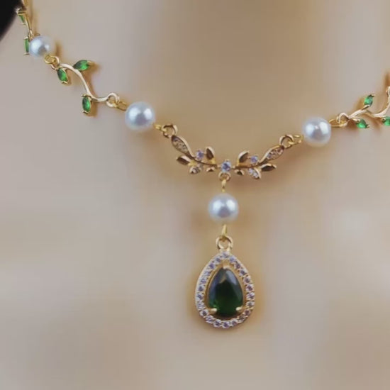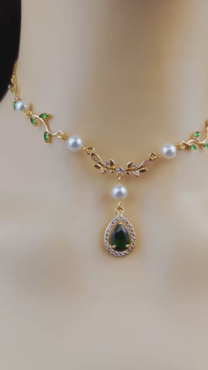 Gold Green Leaf Pearl Fairy Choker Necklace,Olive Leaf Vine Necklace,Emerald Green Teardrop Necklace Earrings ,Leaf bridal Necklace