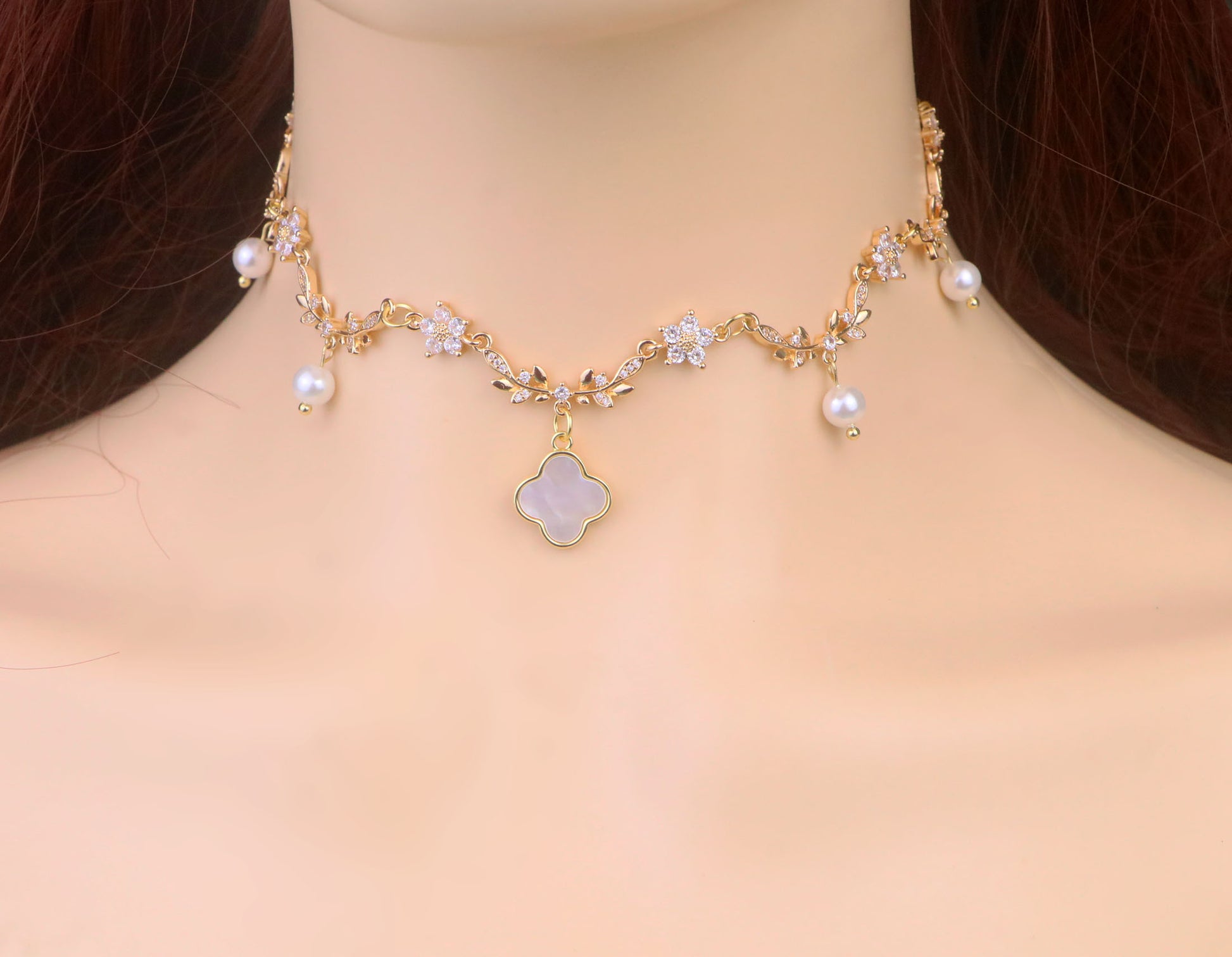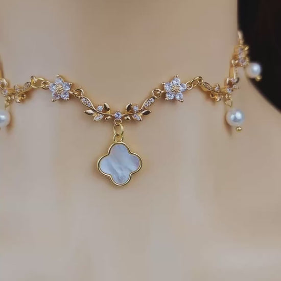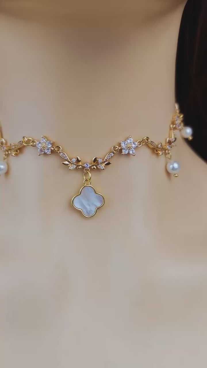 Gold Mother of Pearl Clover Pendant Necklace,Olive Leaf Vine Necklace,Mop Clover Necklace Earrings,Pearl Bridal Necklace,Clover Jewelry,White Diamond Leaf Flower Fairy Choker Necklace,Flower Teardrop Necklace,Regency fairycore Necklace,Leaf bridal Necklace,Stainless Steel Chain,Gifts For Her (DE81)
