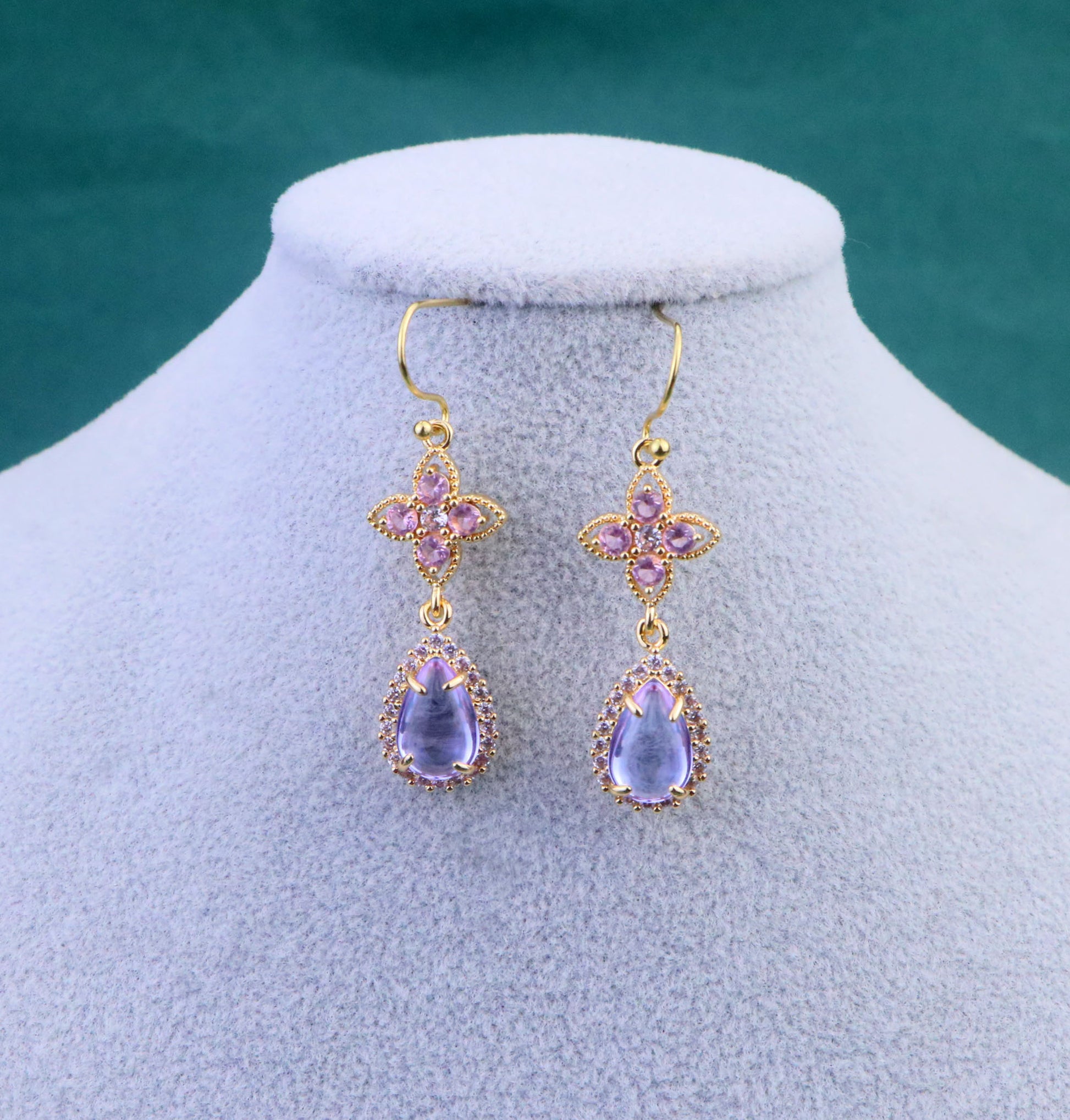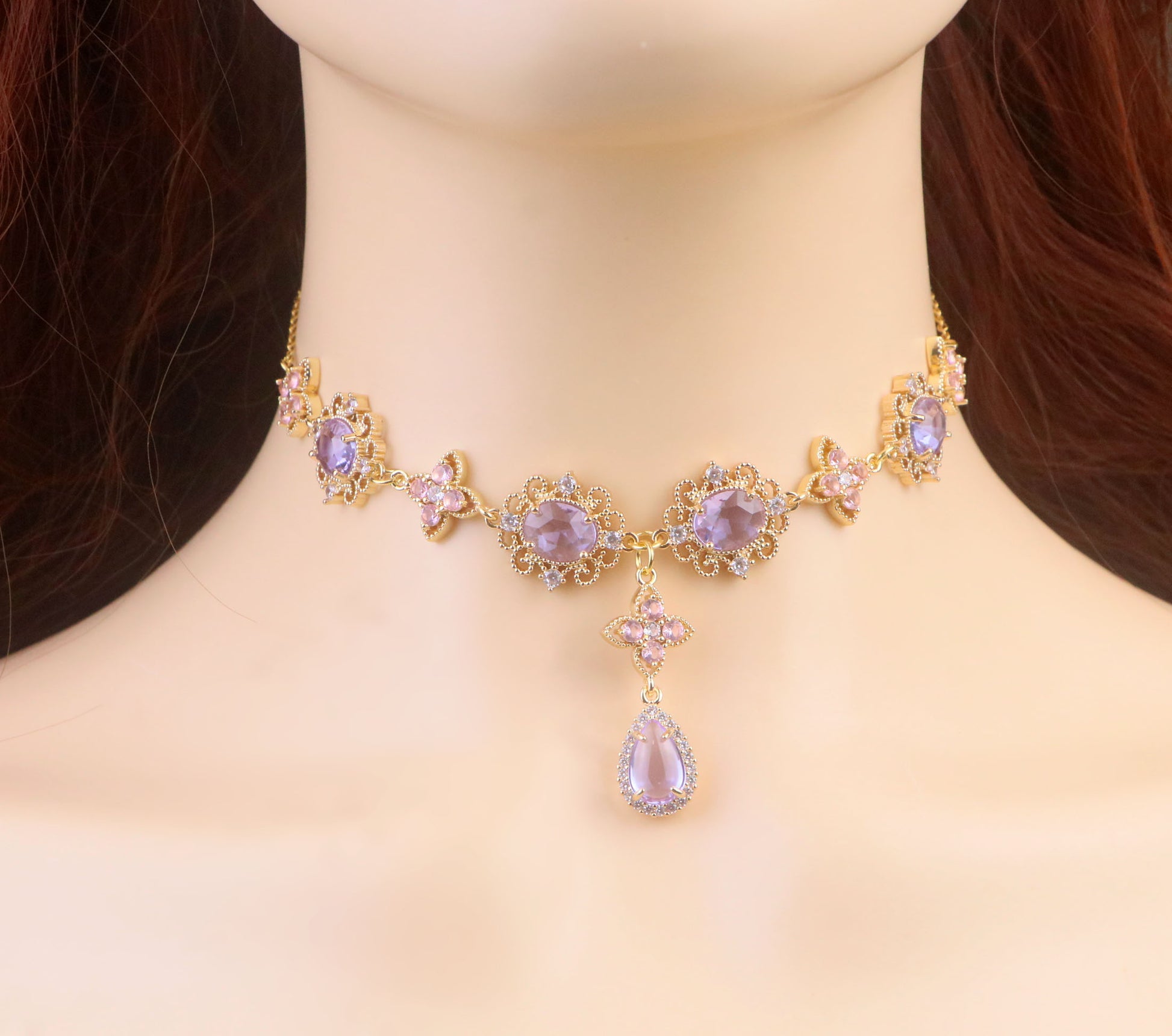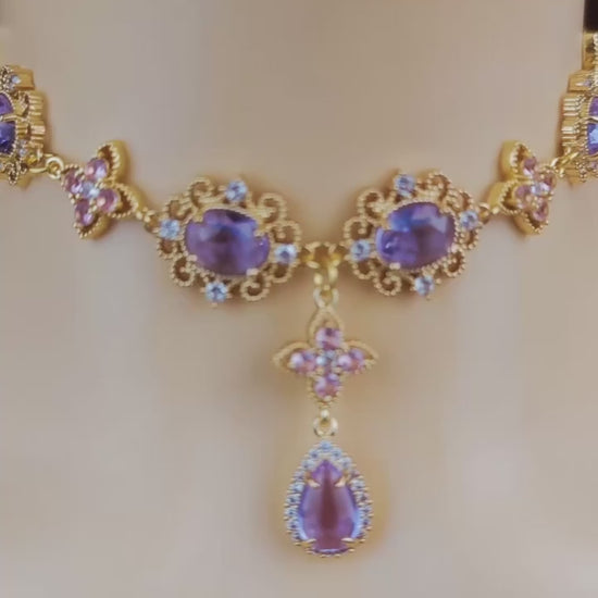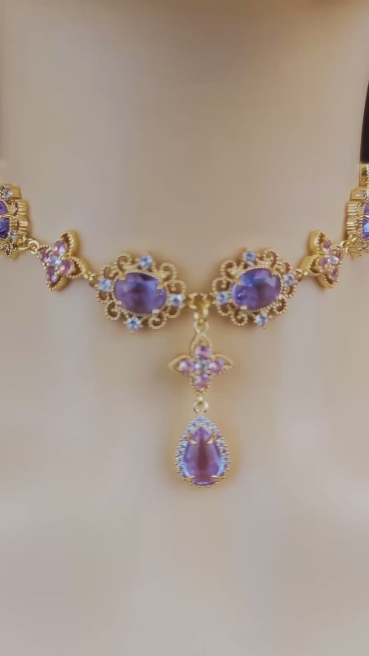 Regency Pink Purple Diamond Choker Necklace,Purple Clover Teardrop Necklace Earrings,bridal wedding Necklace