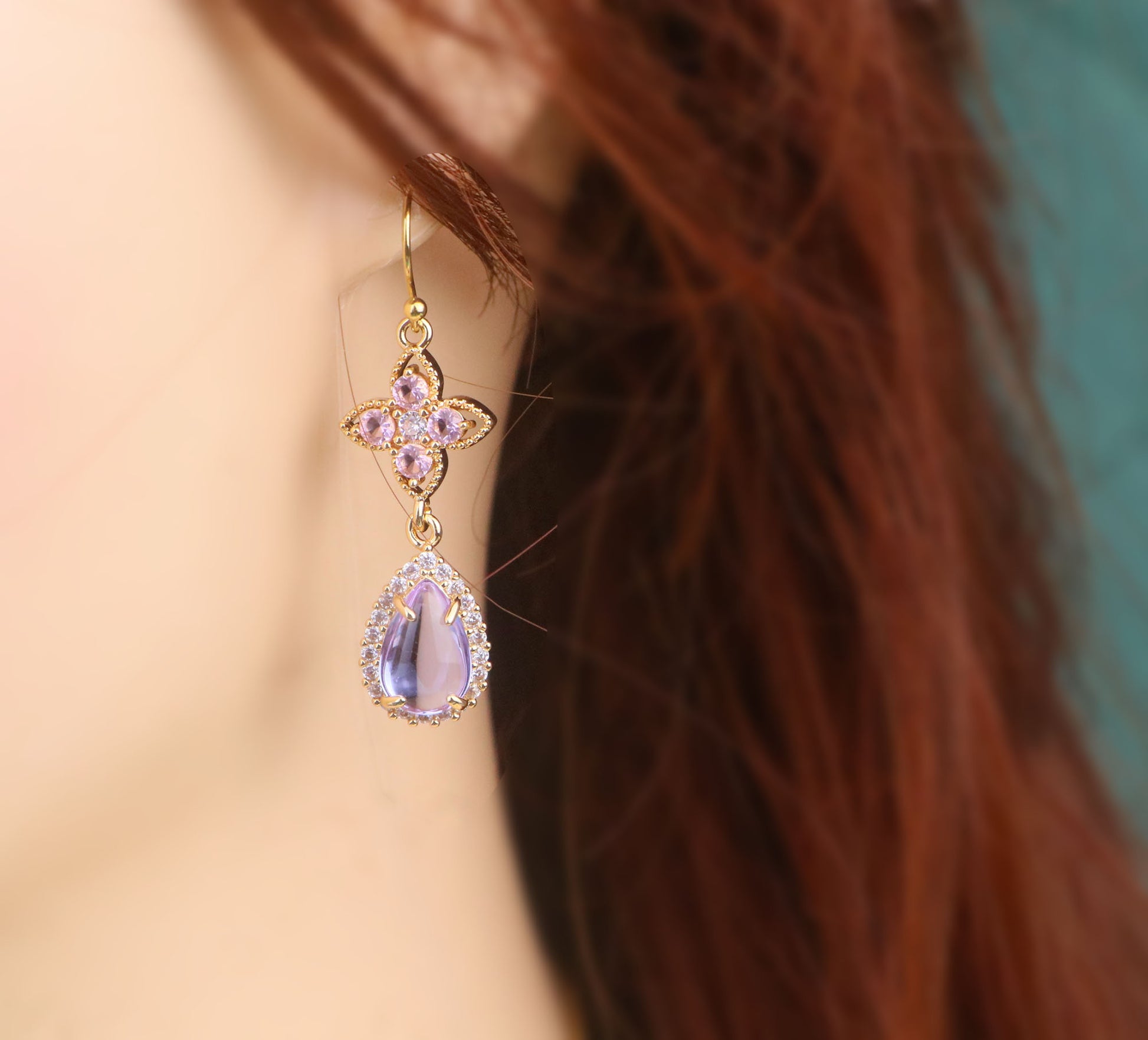 Regency Pink Purple Diamond Choker Necklace,Purple Clover Teardrop Necklace Earrings,bridal wedding Necklace,Fantasy fairycore princess Jewelry,Stainless Steel Chain,Gifts For Her (DE75)