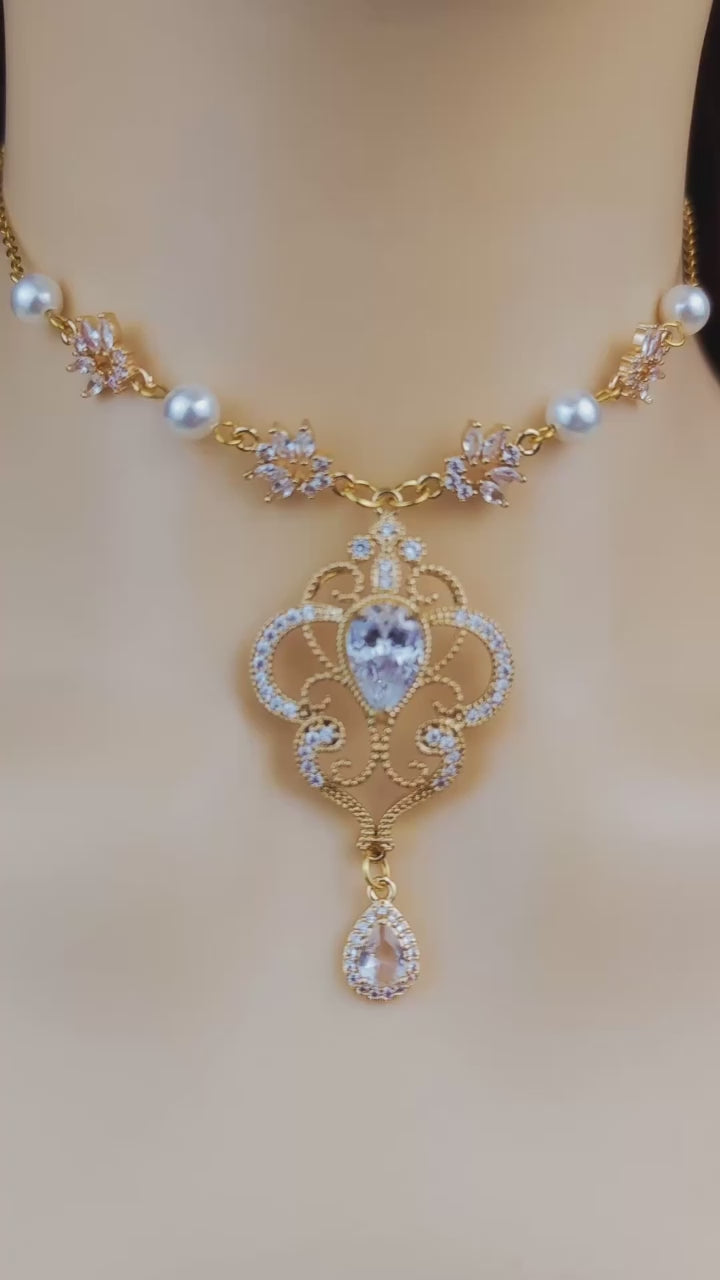 Gold Leaf Pearl Diamond Fairy Choker Necklace,Gold Bridal Wedding Necklace Earrings,Teardrop Necklace, Regency fairycore princess Jewelry