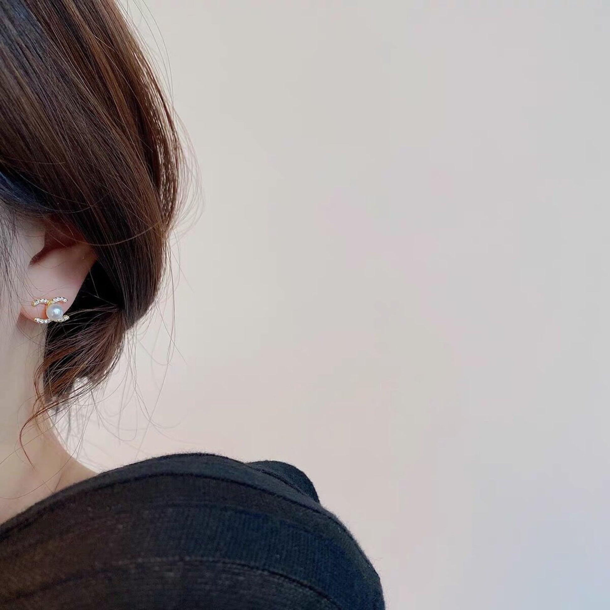 Natural Freshwater Pearl Stud Earrings,Double C Earrings, Crystal CC Earrings,Pearl wedding Earrings