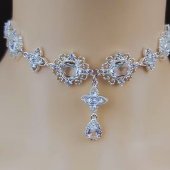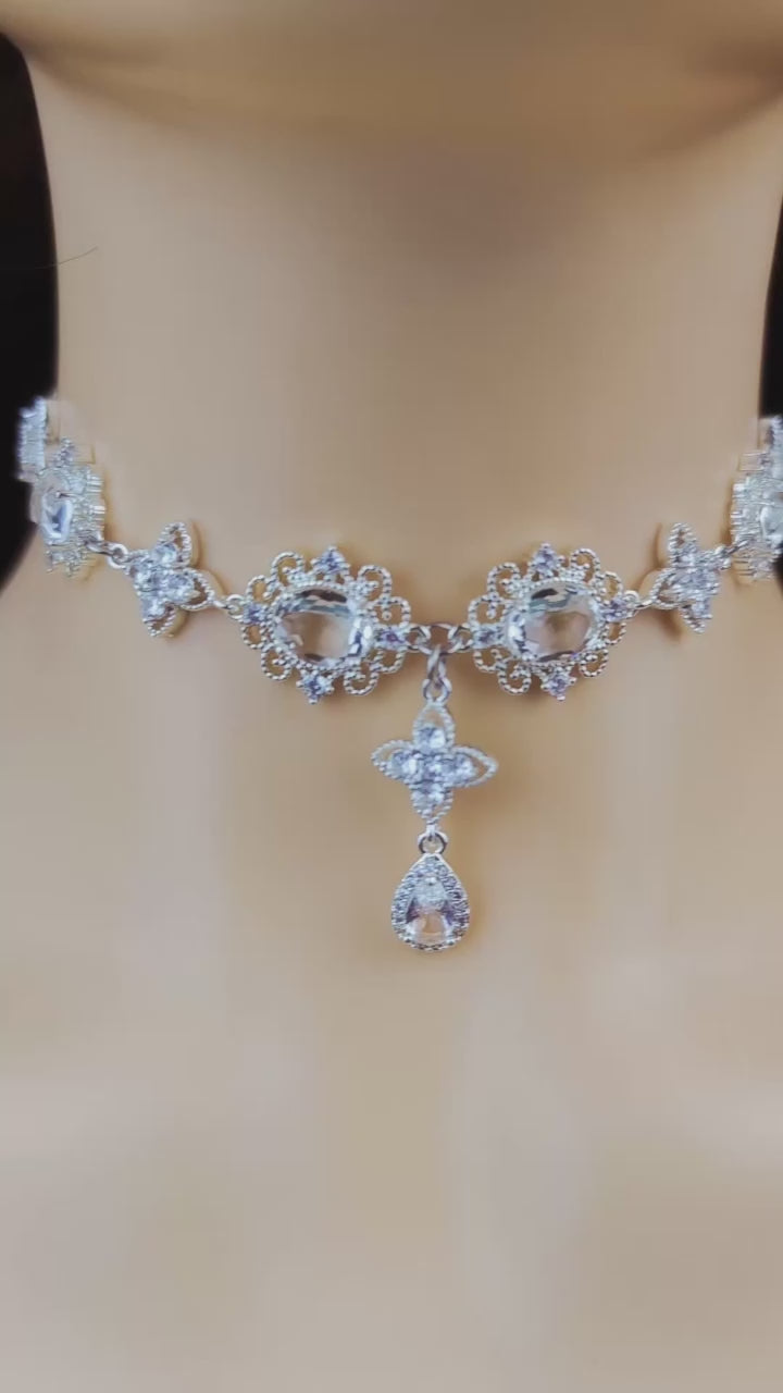 Regency Silver Diamond Choker Necklace,CZ Diamond Clover Teardrop Necklace Earrings,bridal wedding Necklace